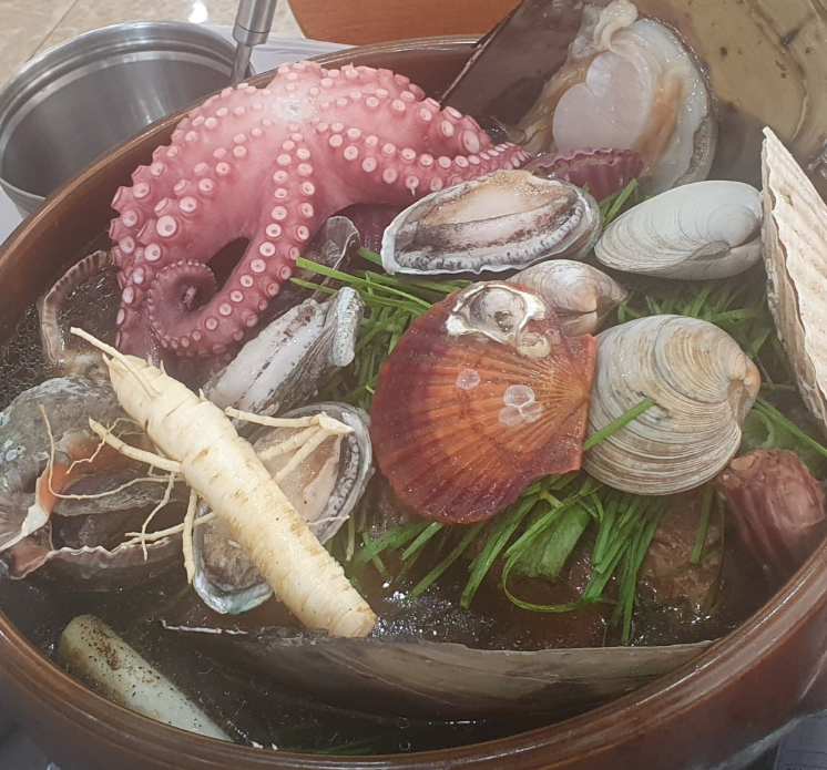 문어, 전복, 키조개, 대합, 가리비, 백생합, 참소라 등 총 일곱 가지 해산물을 함께 넣어 끓입니다.