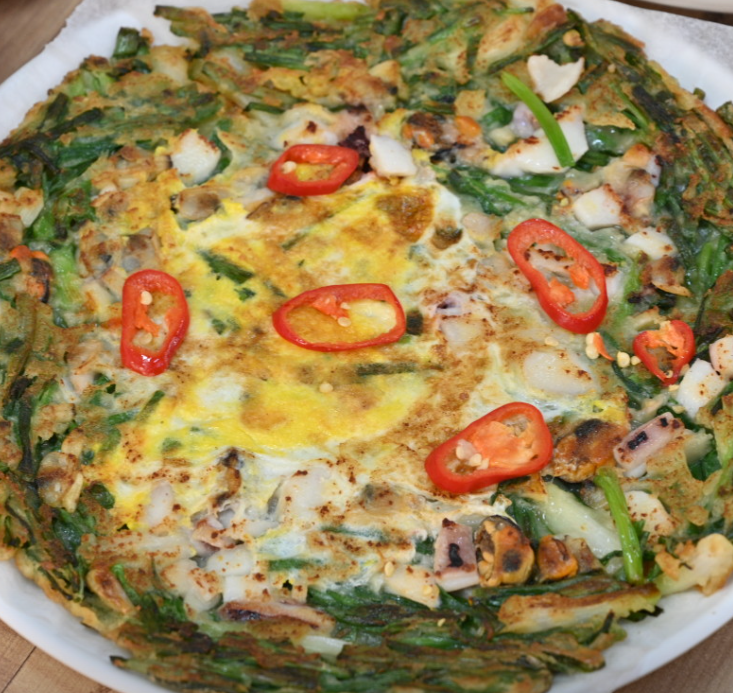 해물파전은 오징어와 파가 아낌없이 들어가 씹는 재미가 있어요.