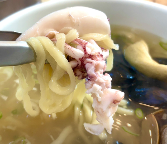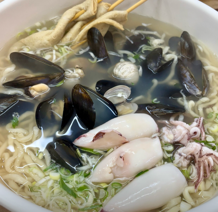 투명하고 맑은 해물 육수에 쫄깃한 면발, 그리고씹을수록 고소한 한치가 그대로 올려져 있어요.