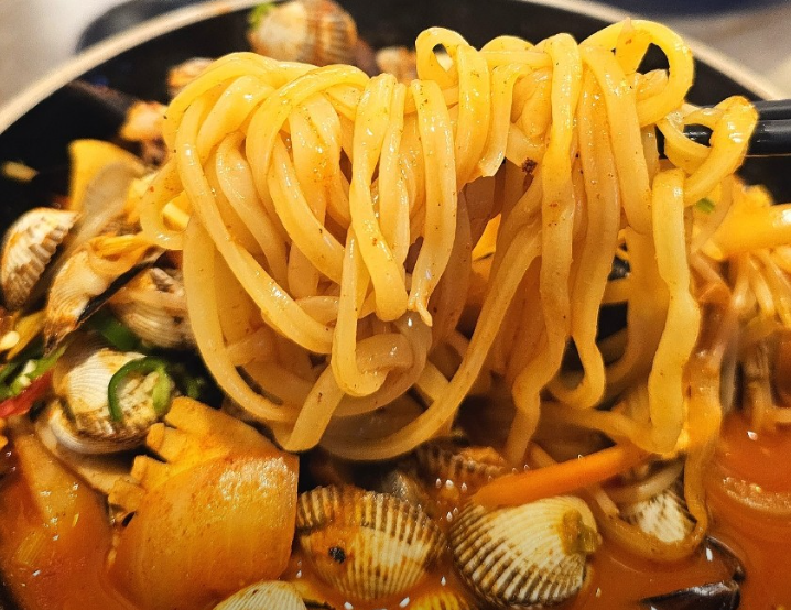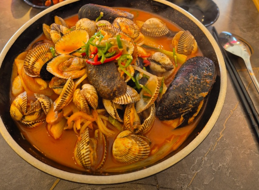 첫 입에 감칠맛 폭발! 국물은 해산물 향이 깊고 칼칼하며, 꼬막이 정말 아낌없이 들어있어요.